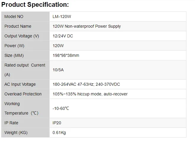 / 120W Power Supply for Led Strips (non-waterproof)